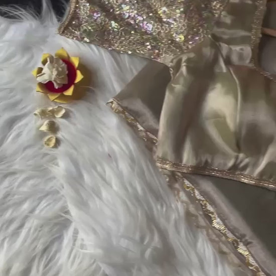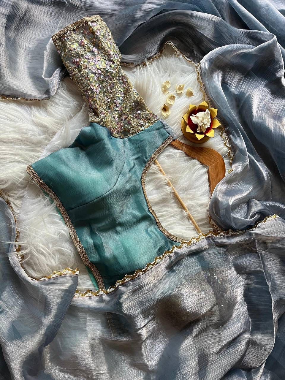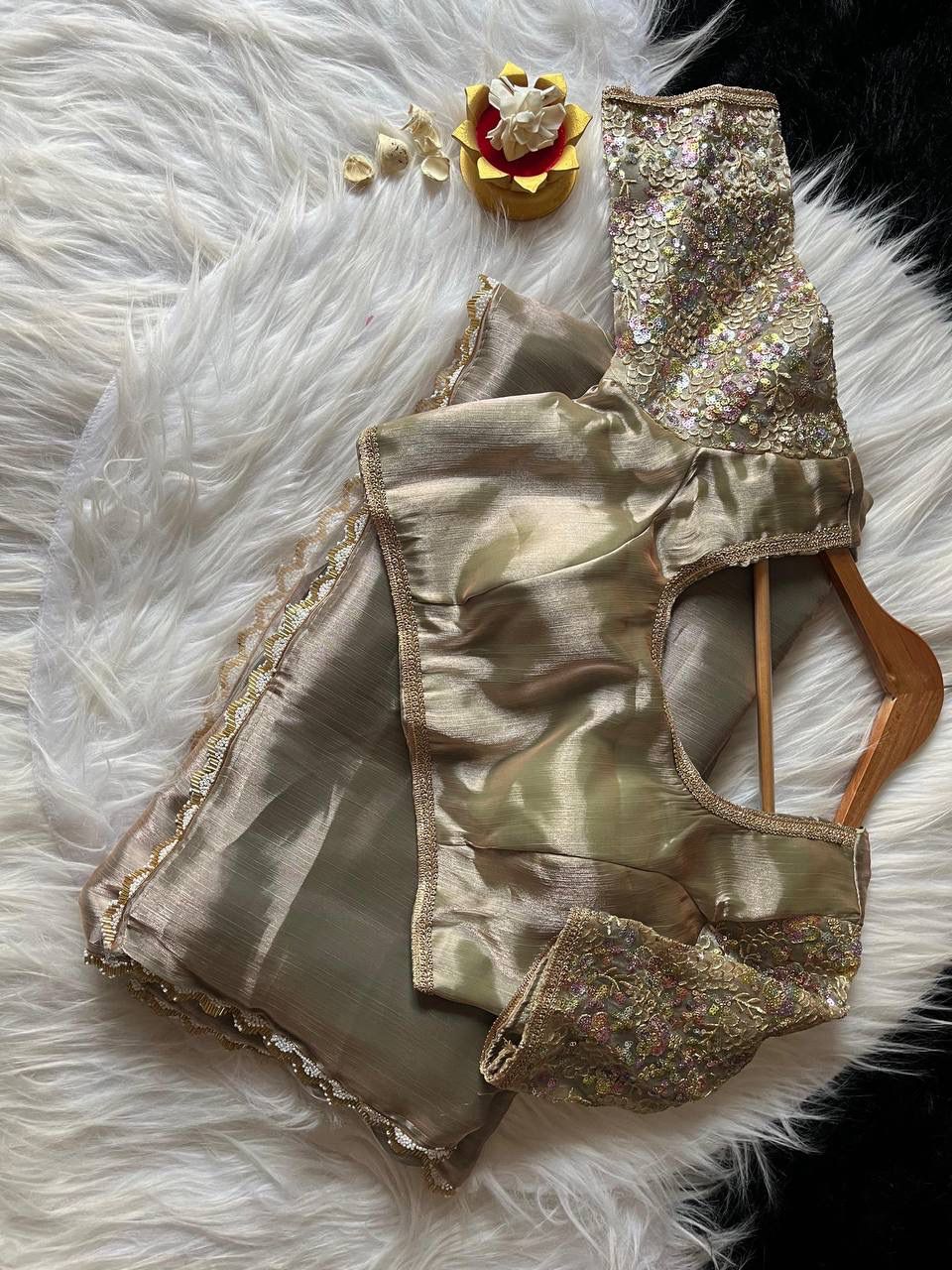 Step into elegance with our latest designer launch – a breathtaking Glass Tissue Zari Saree featuring a luxurious two-tone shimmer, finished with an intricate gold moti lace border and delicate cutwork. A true masterpiece for festive and grand occasions.