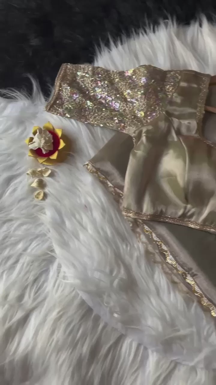 This exclusive saree is paired with a fully stitched blouse crafted from Glass Tissue Silk and Viscose Net, adorned with multi-colour sequin embroidery sleeves—a perfect balance of tradition and trend.
