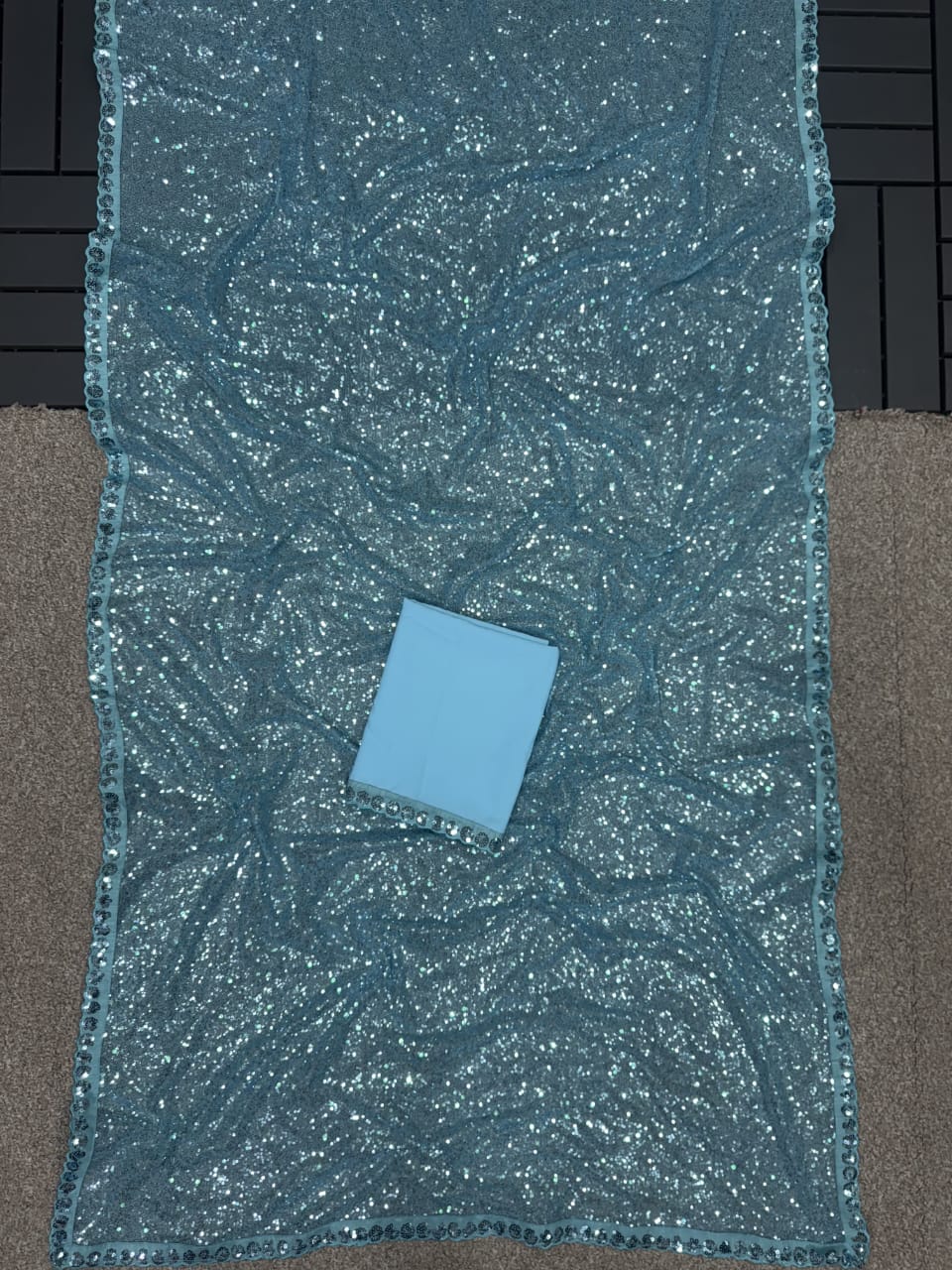 🧵 Work: Dense 3MM & 5MM sequin “khichdi” embroidery across the full saree