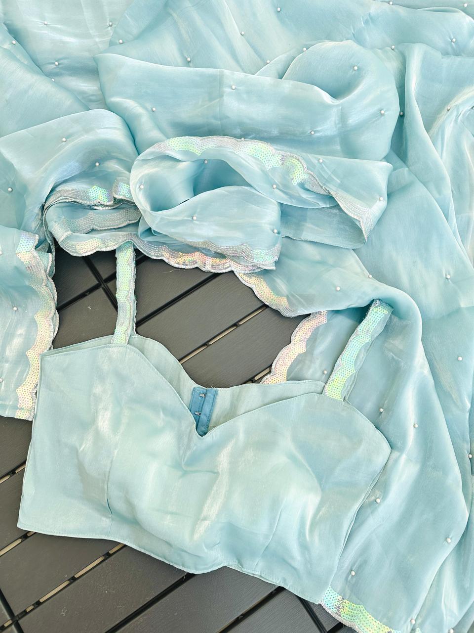 🧵 Work: Intricate pearl work all over with sequined cutwork border