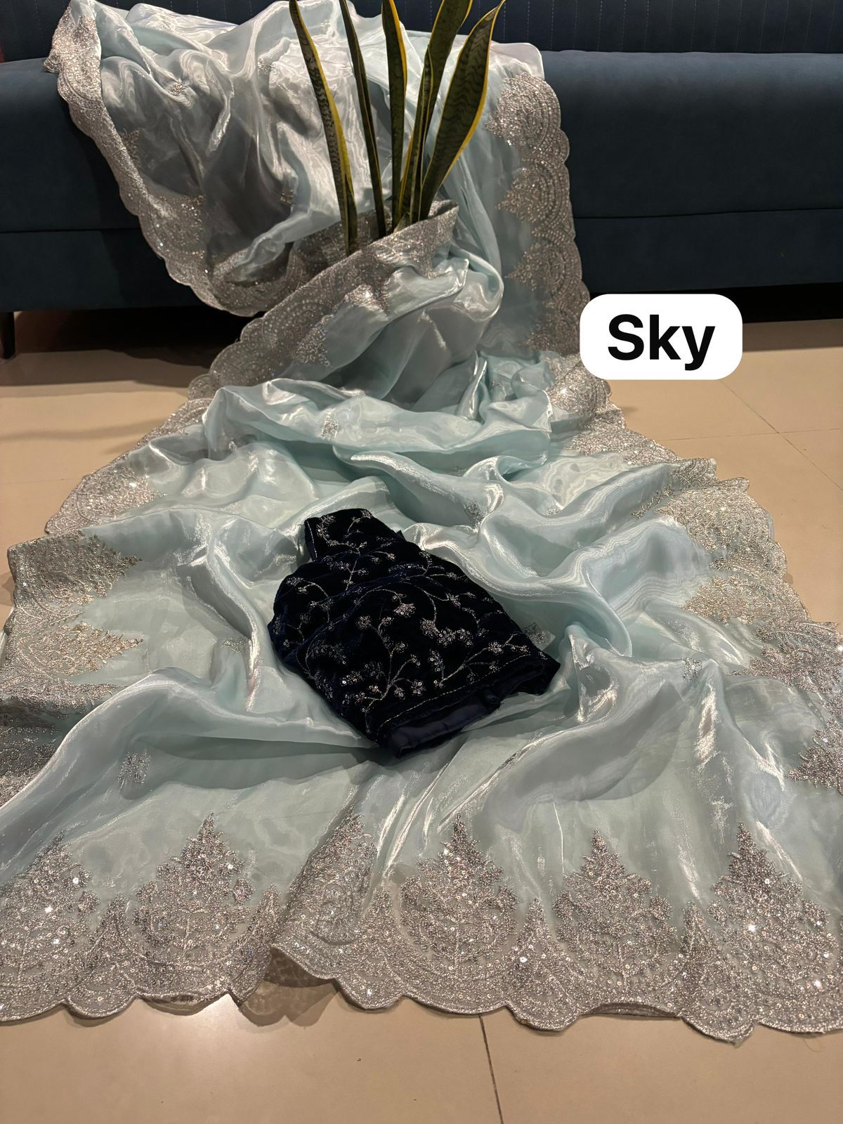 Zaria from the Jimmy Choo Inspired Designer Collection is a glamorous drape featuring zari and sequin embroidery work throughout the body, exuding bold sophistication. The saree pairs with a luxe velvet blouse piece crafted with intricate 9000-level embroidery, perfect for high-end soirées, receptions, and festive nights.